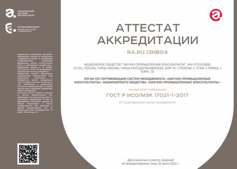 Орган по сертификации систем менеджмента Акционерного общества «Научно-промышленные консультанты» (далее - ОССМ АО «НПК») создан приказом генерального директора Акционерного общества «Научно-промышленные консультанты» (АО «НПК», ИНН: 9731010850) и функционирует в составе АО «НПК». ОССМ АО «НПК» проводит работы по подтверждению соответствия систем менеджмента качества по ГОСТ Р ИСО 9001-2015 «Системы менеджмента качества. Требования» в соответствии с Областью аккредитации. ОССМ АО «НПК» наряду со строгими корпоративными стандартами АО «НПК» придерживается принципов открытости и прозрачности деятельности, и в связи с этим, размещает общедоступную информацию:Деятельность ОССМ АО «НПК» ведётся в соответствии с Политикой в области качества;ОССМ АО «НПК» понимает важность беспристрастности в ходе выполнения работ по сертификации систем менеджмента качества и гарантирует объективность своих действий, посредством утверждения Политики по обеспечению беспристрастности и соблюдения требований внутренних документированных процедур по обеспечению беспристрастности;Работа с жалобами и апелляциями на решения и/или действия/бездействия ОССМ АО «НПК» осуществляется Комиссией по жалобам и апелляциям, созданной в соответствии с Положением о комиссии по жалобам и апелляциям, и действующей согласно Порядка рассмотрения жалоб и апелляций;